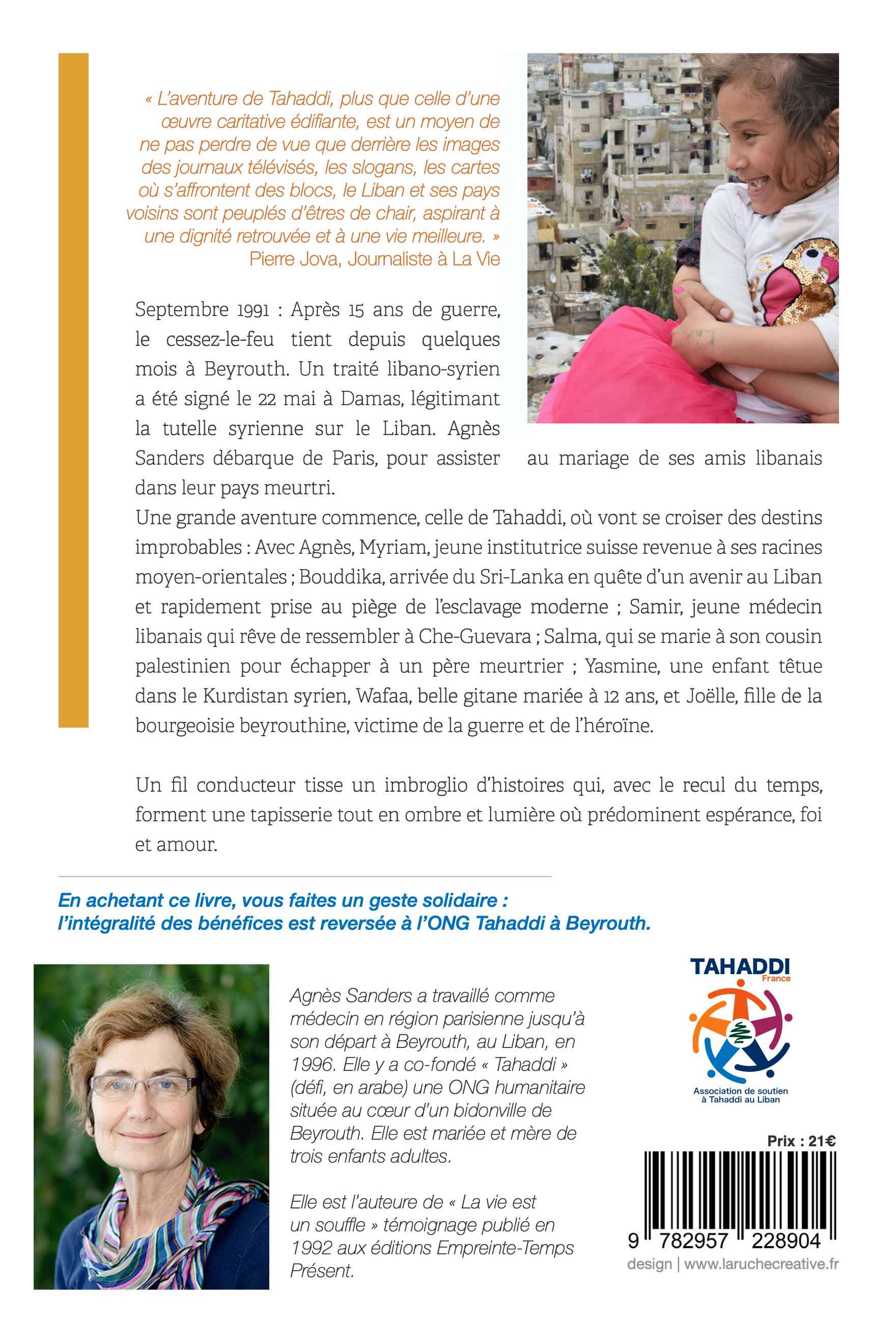 Sortie du Livre : Tahaddi, sacré défi !d'Agnès Sanders En vente au profit de l'oeuvre de Tahaddi qui a créé une école et un dispensaire dans un bidonville de Beyrouth. Contact Tahaddi +33 6 16 84 11 97 tahaddifrance@gmail.com